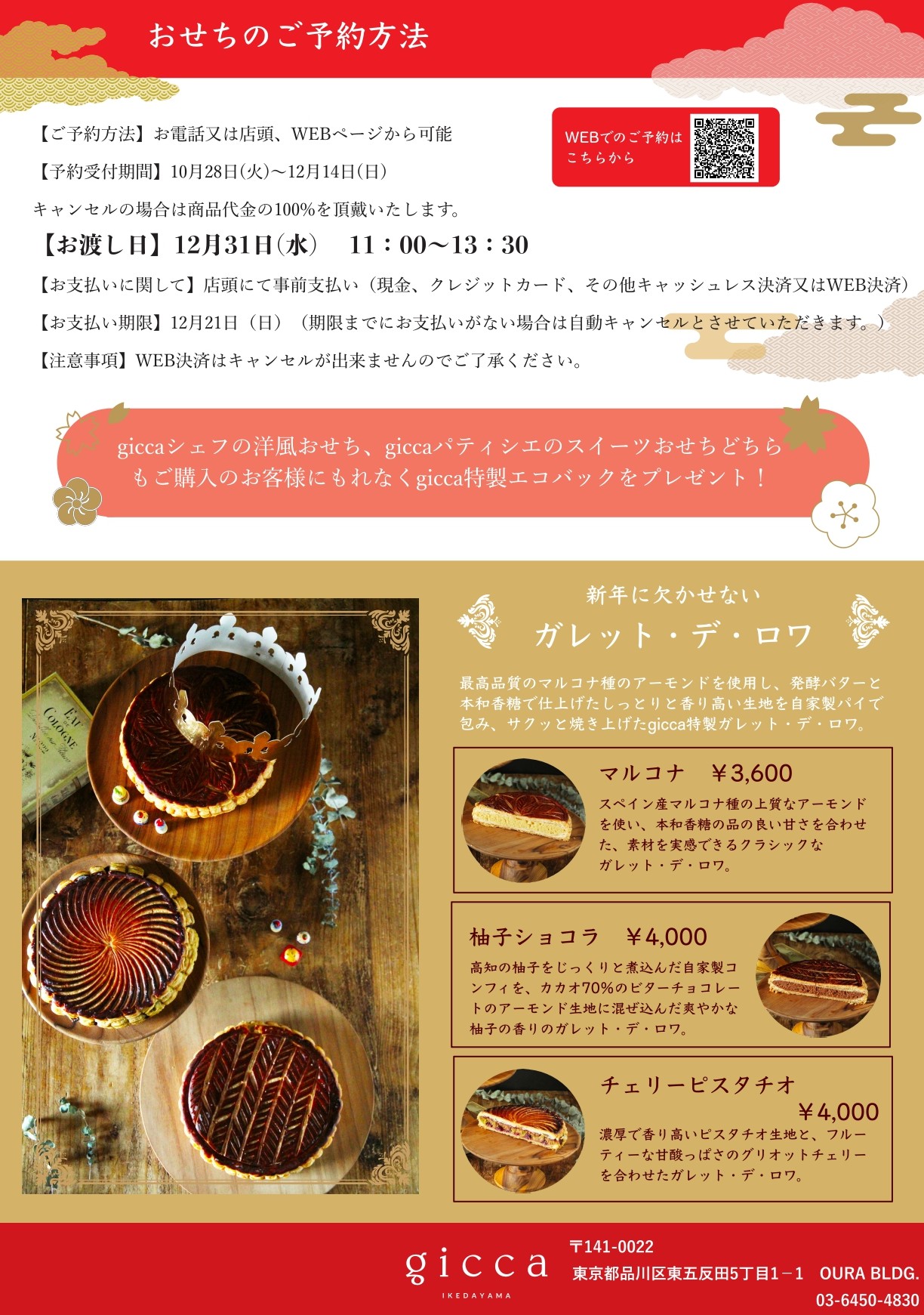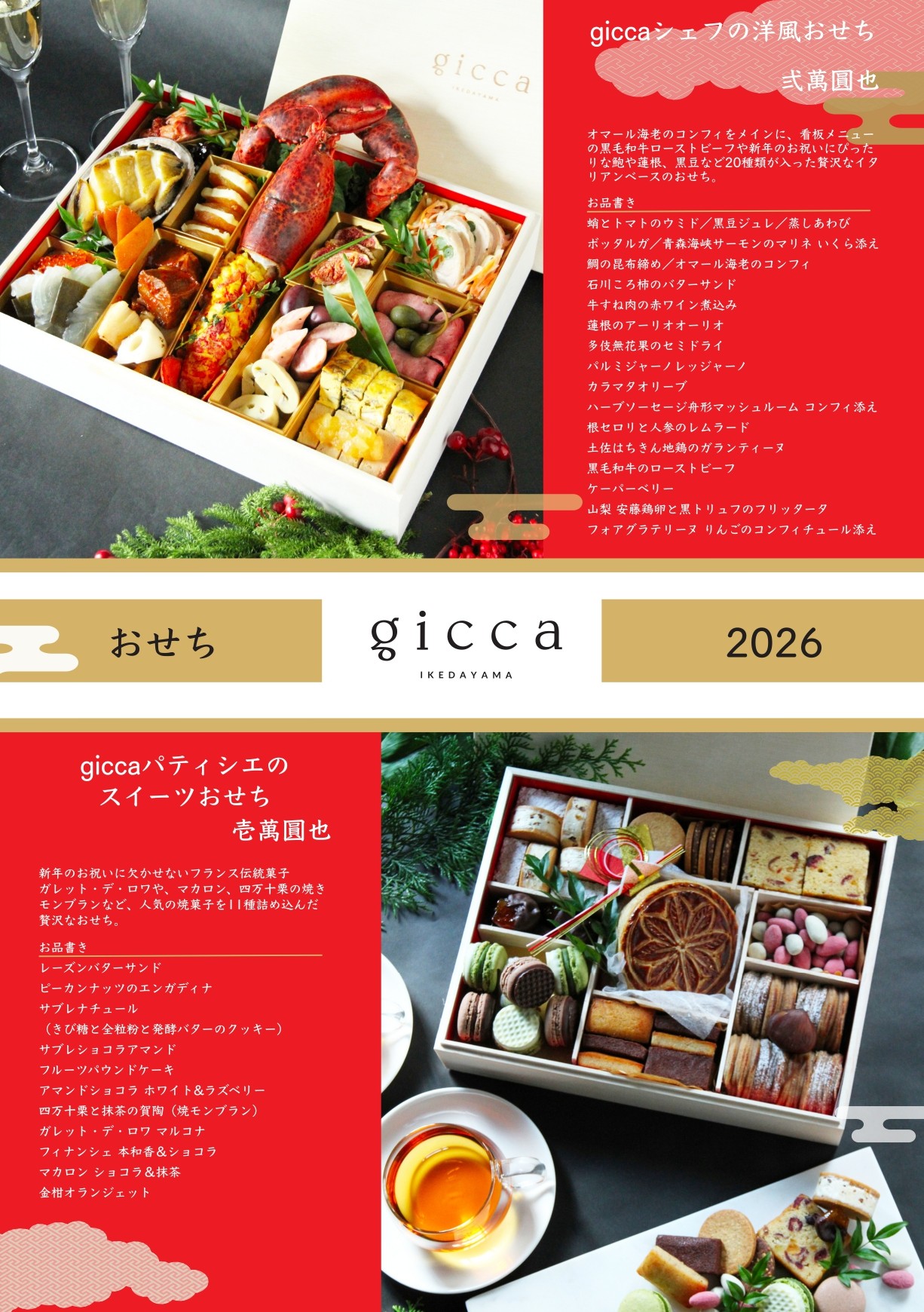 2026年のおせちは、洋風のおせち、と、スイーツおせち、をご用意いたしました。イタリアンシェフとパティシエシェフの心を込めたgicca特製手作りおせち。さらに、新年には欠かせないgiccaでは毎年恒例のガレット・デ・ロワ。お陰様で、毎年売切れております。ご予約はお早めに!